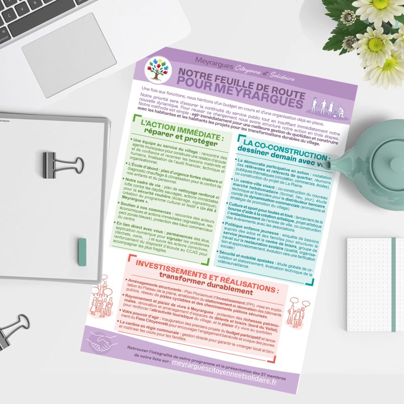 - Notre cadre de vie : plan de nettoyage renforcé et lutte contre les dépôts sauvages, actions immédiates pour la sécurité routière (éclairage, signalétique), création du programme culturel et festif “Un été à Meyrargues”.