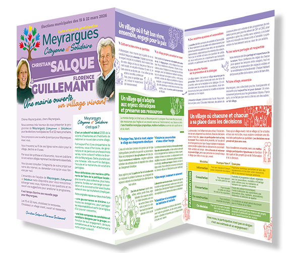 AXE 6 : Meyrargues, un village où chacune et chacuna sa place dans les décisions La démocratie, c’est l’affaire de toutes et tous. Fini de donner son avis uniquement aux élections, finies les décisions prises à huis clos : place à la participation tout au long du mandat ! Nous…